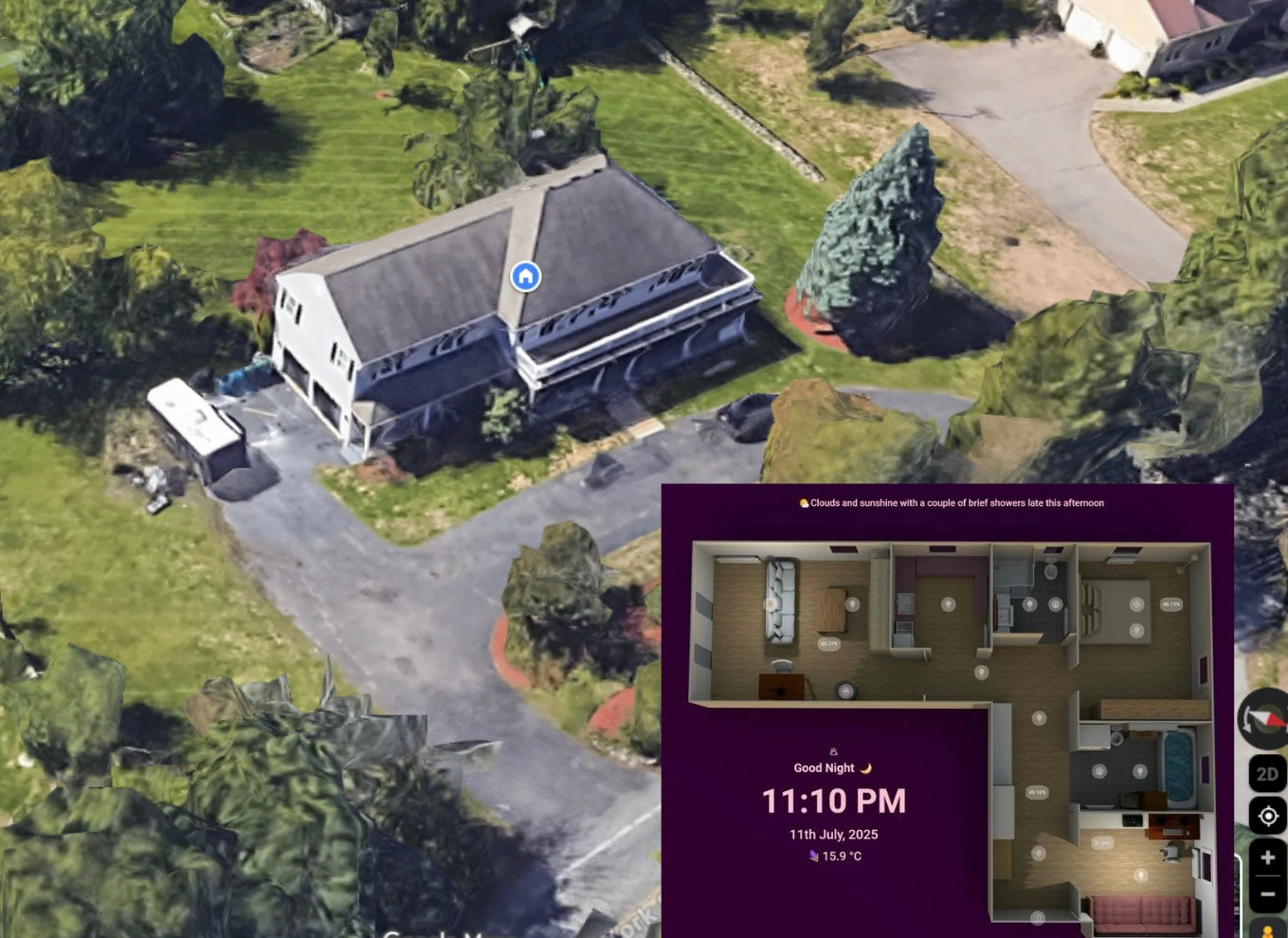 Layered above your property is a real-time geo-dome mesh, with live radar weather, star constellations, and even flight tracking passing directly over your house - creating a breathtaking, immersive experience that feels like science fiction.